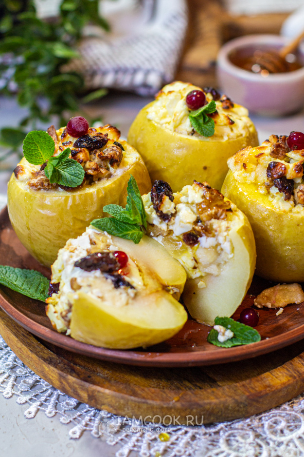 Шаг 3: Аккуратно наполните яблоки творожной массой и разместите их в чаше аэрогриля. Запекайте при температуре 180°C около 30 минут. Если верх начнет слишком румяниться, накройте яблоки фольгой, чтобы они не подгорали.