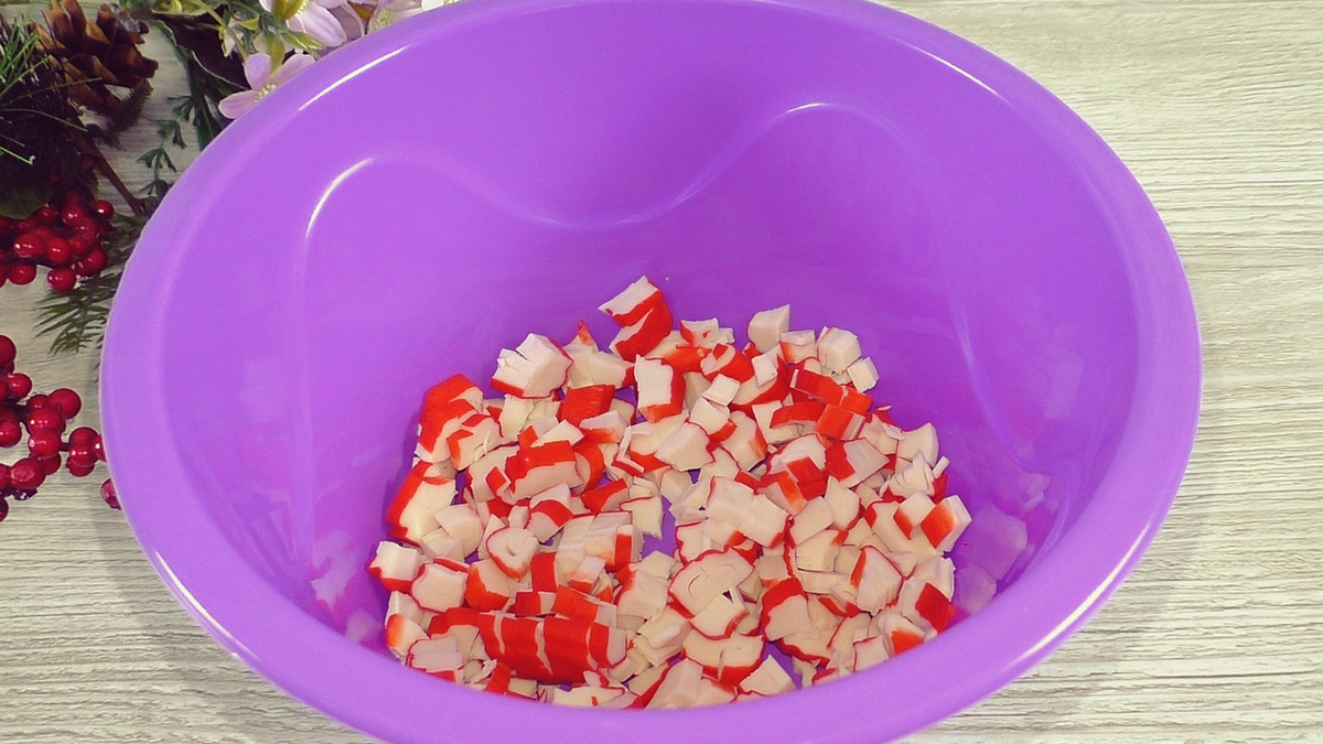 1. Начинаем с нарезки крабовых палочек – их следует измельчить произвольно, чтобы они хорошо смешались с другими ингредиентами.