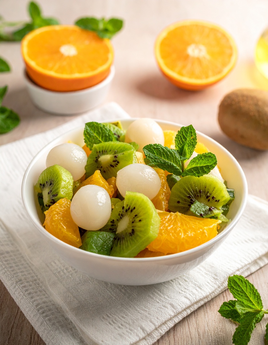 Если удастся заполучить свежие плоды, стоит попробовать использовать их в интересном блюде. Личи прекрасно сочетается с цитрусовыми и ароматной зеленью. Вот один из простых и эффектных вариантов — освежающий салат с личи и мятой: