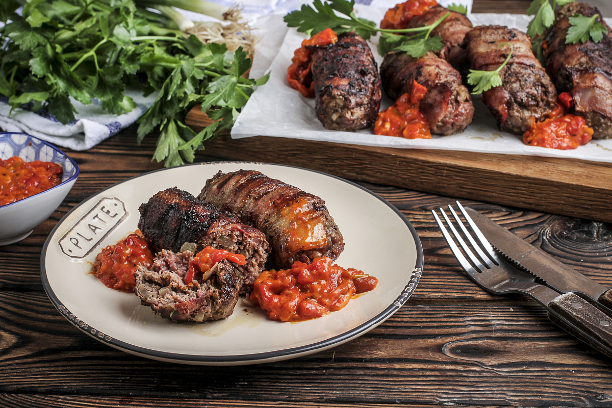 Шаг 2: Разогреть угли в мангале до красного цвета. Сформировать из фарша продолговатые котлеты и обернуть их беконом. Выложить на решетку и готовить около 15 минут, периодически переворачивая.