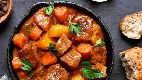 - Контролируйте время. Готовьте жаркое около часа, проверяя его каждые 30 минут. Оно будет готово, когда легко прокалывается вилкой. Остужайте мясо прямо в соусе — так оно впитает еще больше аромата.