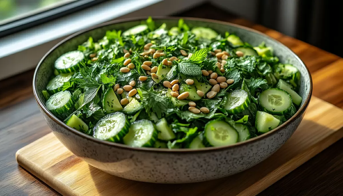 Салат из огурца, авокадо и зелени с кедровыми орешками